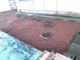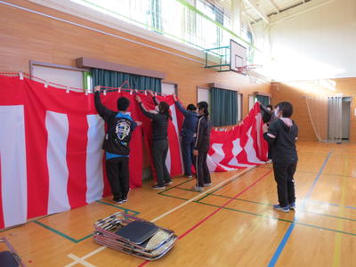 放課後、職員で体育館に紅白幕をはりました。