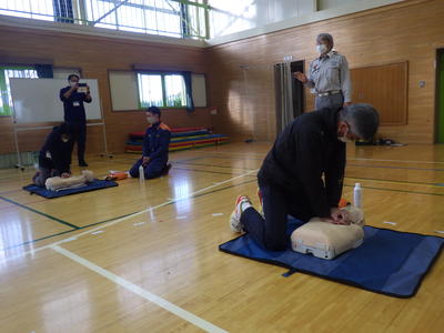 川里分署の救急隊員さんの説明を聞きながら、訓練用の人形とAEDを使って実践練習しました。