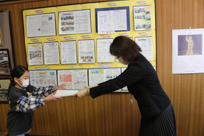 代表児童による通知表授与、1年間を振り返っての作文発表、表彰が行われました。