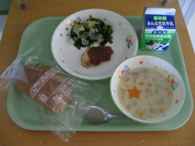 主食部門2位の黒パン、主菜部門2位の鶏肉のバーベキューソース、副菜部門2位のわかめサラダ、汁物部門1位のコーンクリームスープを組み合わせました。