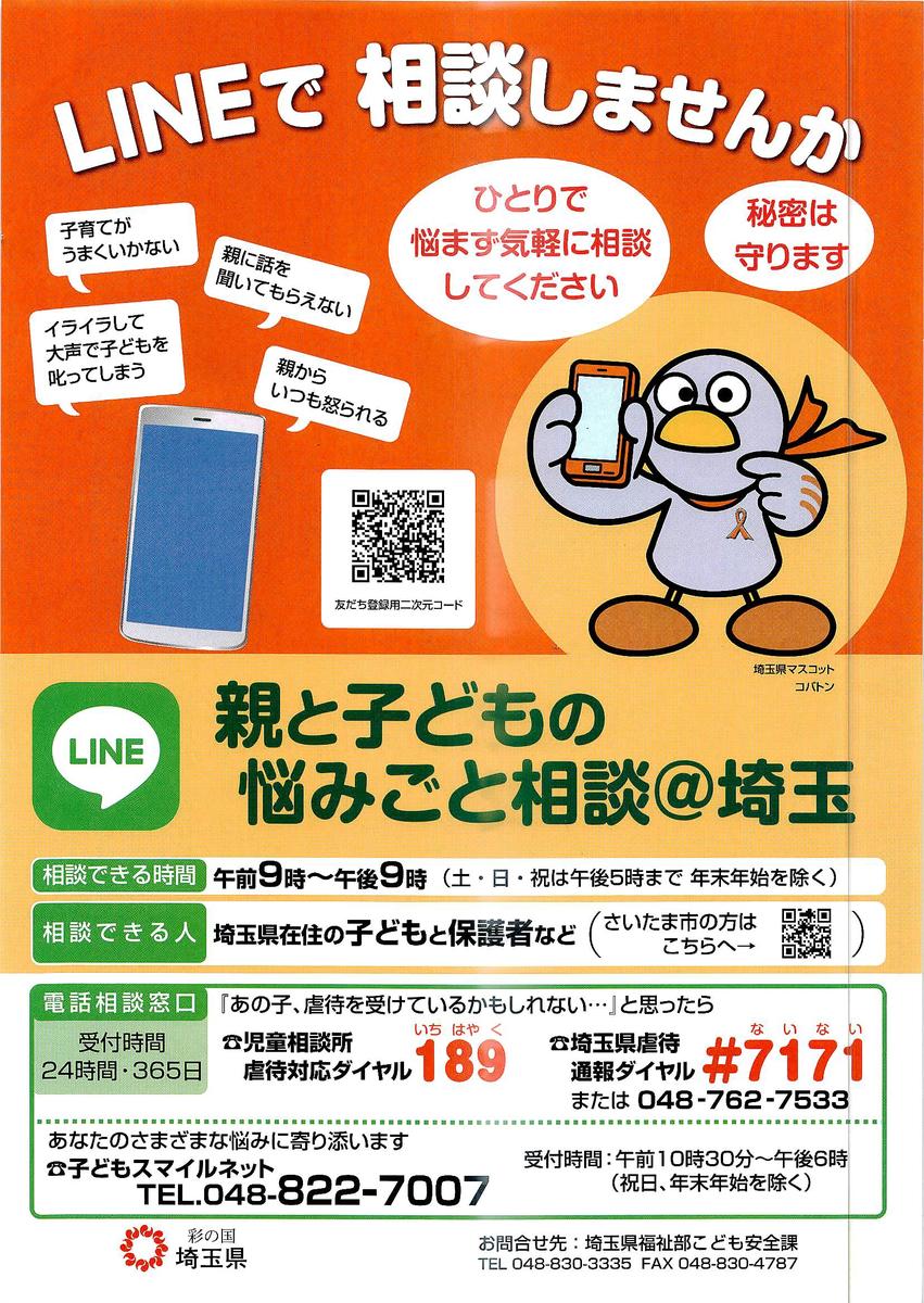 埼玉県福祉部こども安全課より、児童虐待の防止のために開設されたSNSによる相談窓口について通知がありました。チラシは先日配付をいたしましたが、ご家庭でご活用ください。